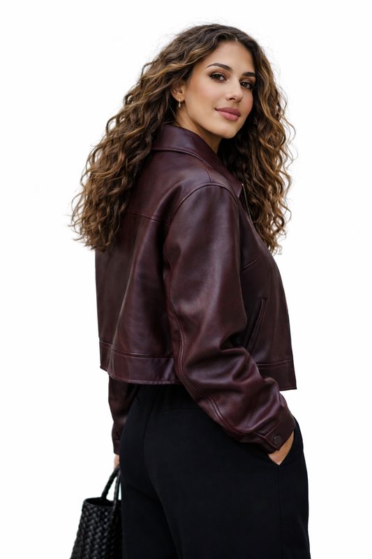 Ravéa leren damesjas – wijnrode korte jas met ritssluiting en revers