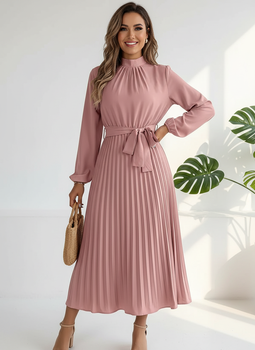 Stel je een jurk voor die meteen zachtheid en elegantie uitstraalt. De fijne plooien bewegen soepel met je mee, terwijl de tailleceintuur precies genoeg definitie geeft zonder in te leveren op comfort. Deze jurk voelt licht, luchtig en toch verfijnd aan — ideaal voor momenten waarop je moeiteloos stijlvol wilt verschijnen, of dat nu op kantoor is, een diner of een speciale gelegenheid.