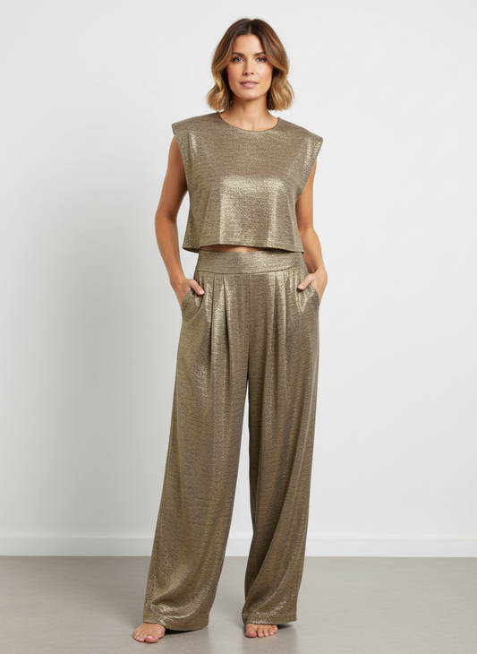 Glanzende two-piece set met cropped top en wide-leg broek – Alina