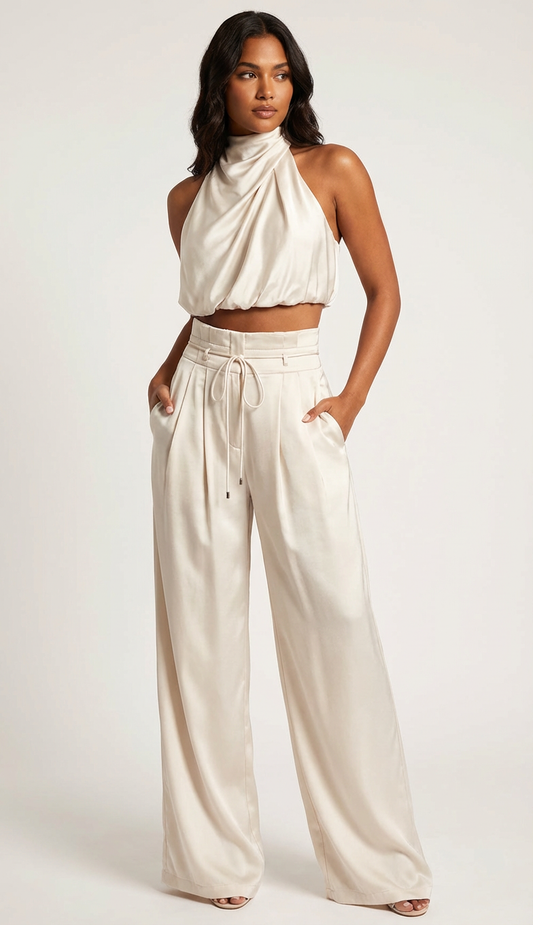 Tweedelige satijnen set met haltertop en wijde broek
